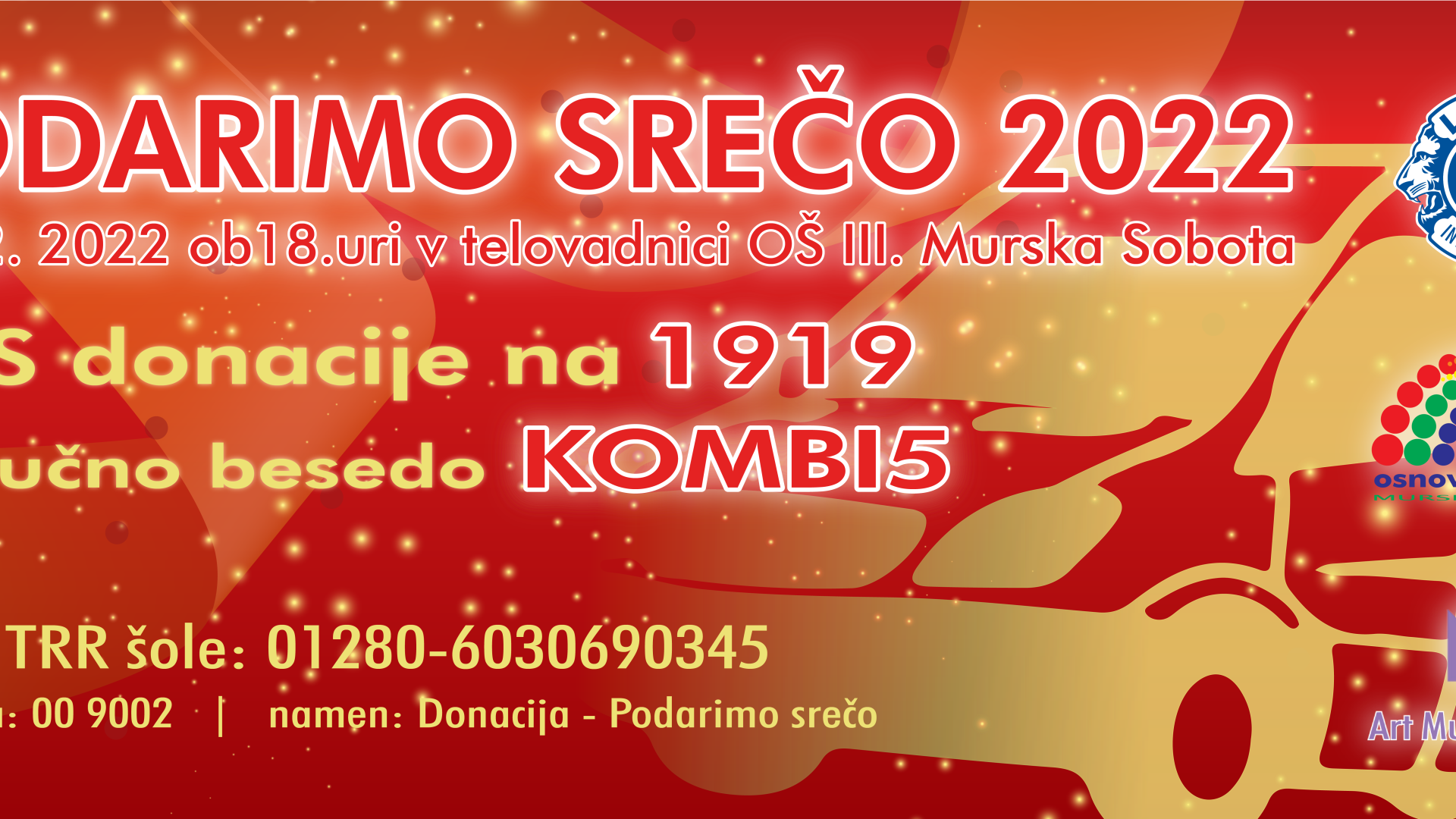 Osnovna šola III Murska SobotaVabljeni na veliki dobrodelni koncert 'PODARIMO SREČO 2022', na katerem bodo nastopili slovenski glasbeniki in učenci Osnovne šole IV Murska Sobota.