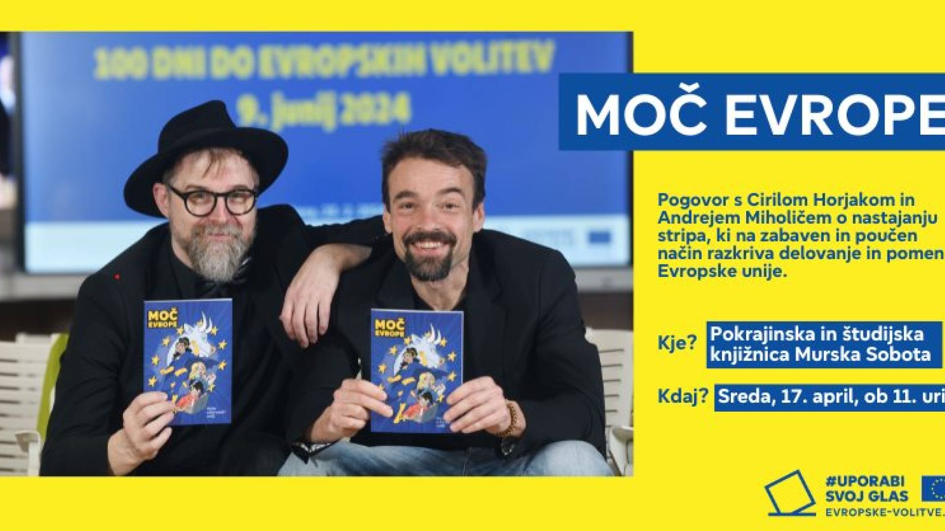 Vljudno vas vabimo, da se nam v sredo, 17. aprila, ob 11. uri pridružite v Pokrajinski in študijski knjižnici Murska Sobota (Zvezna ulica 10, Murska Sobota) na pogovoru z avtorjem Cirilom Horjakom in urednikom Andrejem Miholičem o nastajanju stripa, njegovem pomenu, prednostih evropskega povezovanja in pomenu aktivnega državljanstva, tudi v luči bližajočih se evropskih volitev 9. junija.