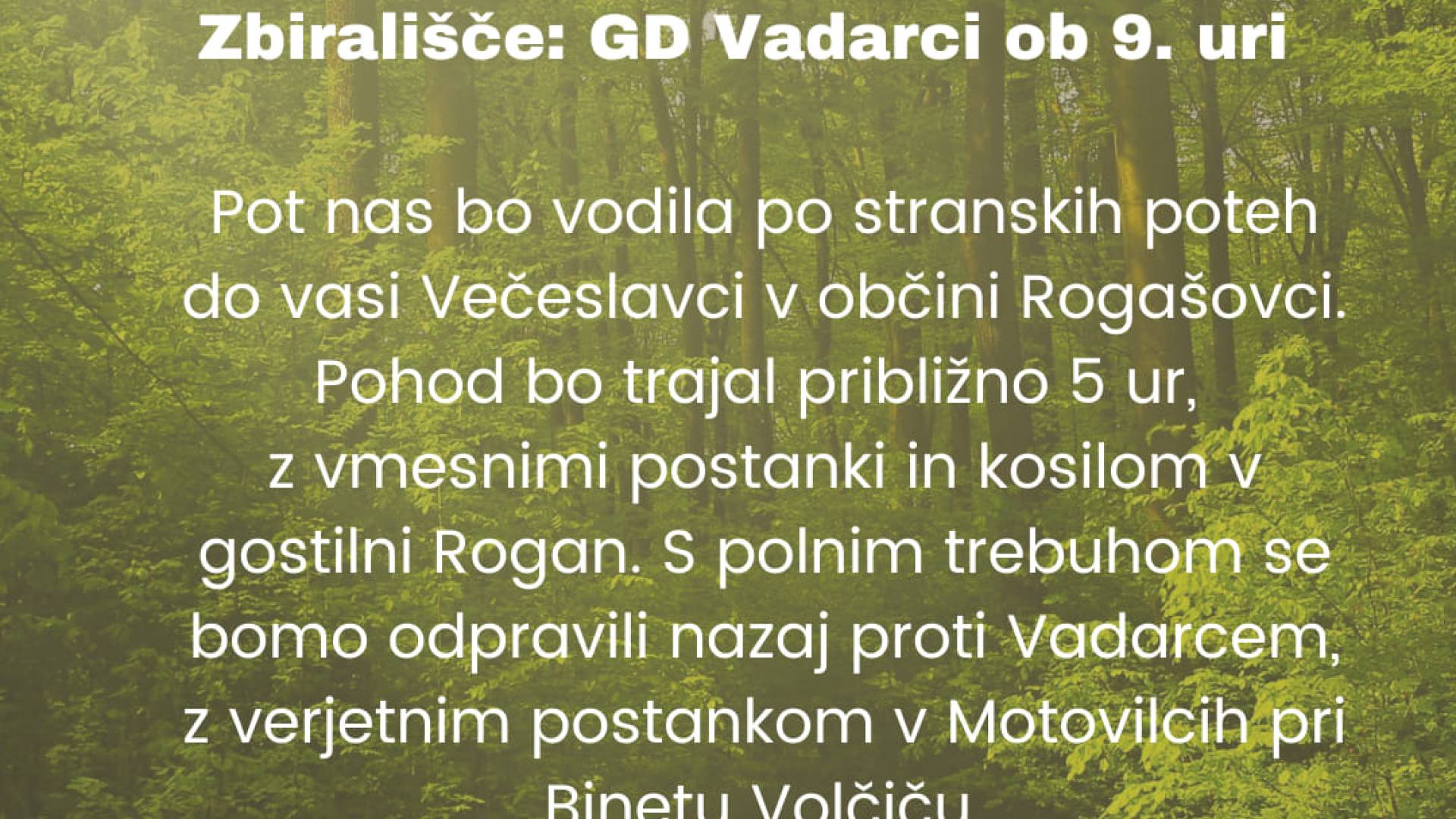 KTD Lipa Vadarci organizira v nedeljo tradicionalni pohod. Tokrat se bomo podali v sosednji občini Rogašovci in Grad. Luštno bo kot vedno 🌳🌞🌸 Ne pozabite se primerno obleči in obuti. 🚶🚶‍♀️Pa v nahrbtnik ne pozabite dati pijače in kakšnega prigrizka 😉🍎🍌🥪🍪 Lepo vabljeni, da se nam pridružite 🌲🍀🐞
