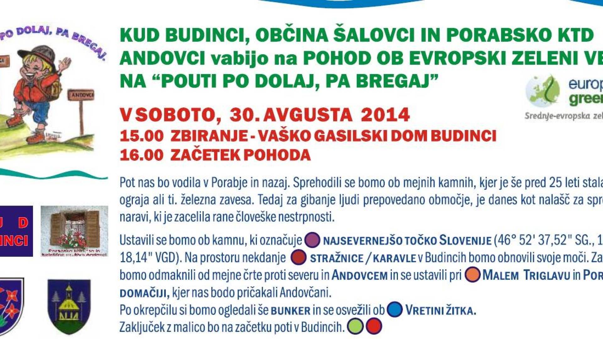 Odhod izpred Vaško-gasilskega doma BudinciKUD BUDINCI, OBČINA ŠALOVCI IN PORABSKO KTD ANDOVCI vabijo na POHOD OB EVROPSKI ZELENI VEZI NA “POUTI PO DOLAJ, PA BREGAJ”