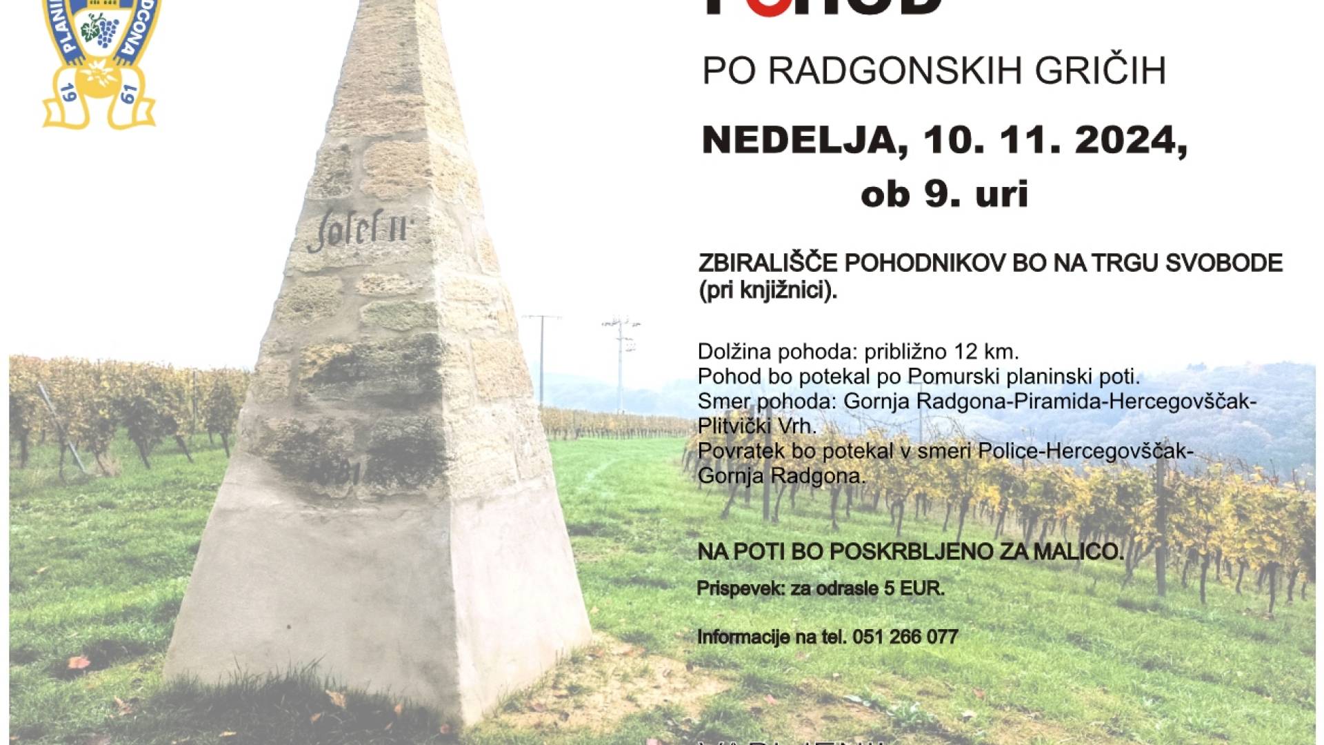 Le kdo se ne bi sprehodil med vso to iskrivo lepoto naših goric? Pohod bo v nedeljo, 10. 11. 2024. Pohod bo potekal v smeri Gornja Radgona-Piramida-Hercegovščak-Lomanoše-Plitvički vrh-Police-Gornja Radgona. Dolžina pohoda je okrog 12 km. Zbirališče pohodnikov bo v Gornji Radgoni na Trgu svobode (tržnica pri knjižnici). Začetek pohoda bo ob 9. uri in bo potekal pod vodstvom vodnikov Planinskega društva Gornja Radgona. Na poti bo poskrbljeno za planinsko malico. Prispevek za odrasle je 5 €. Hodili bomo tudi po gozdu, po travi med goricami, po makadamskih poteh, zato priporočamo pohodniško obutev.