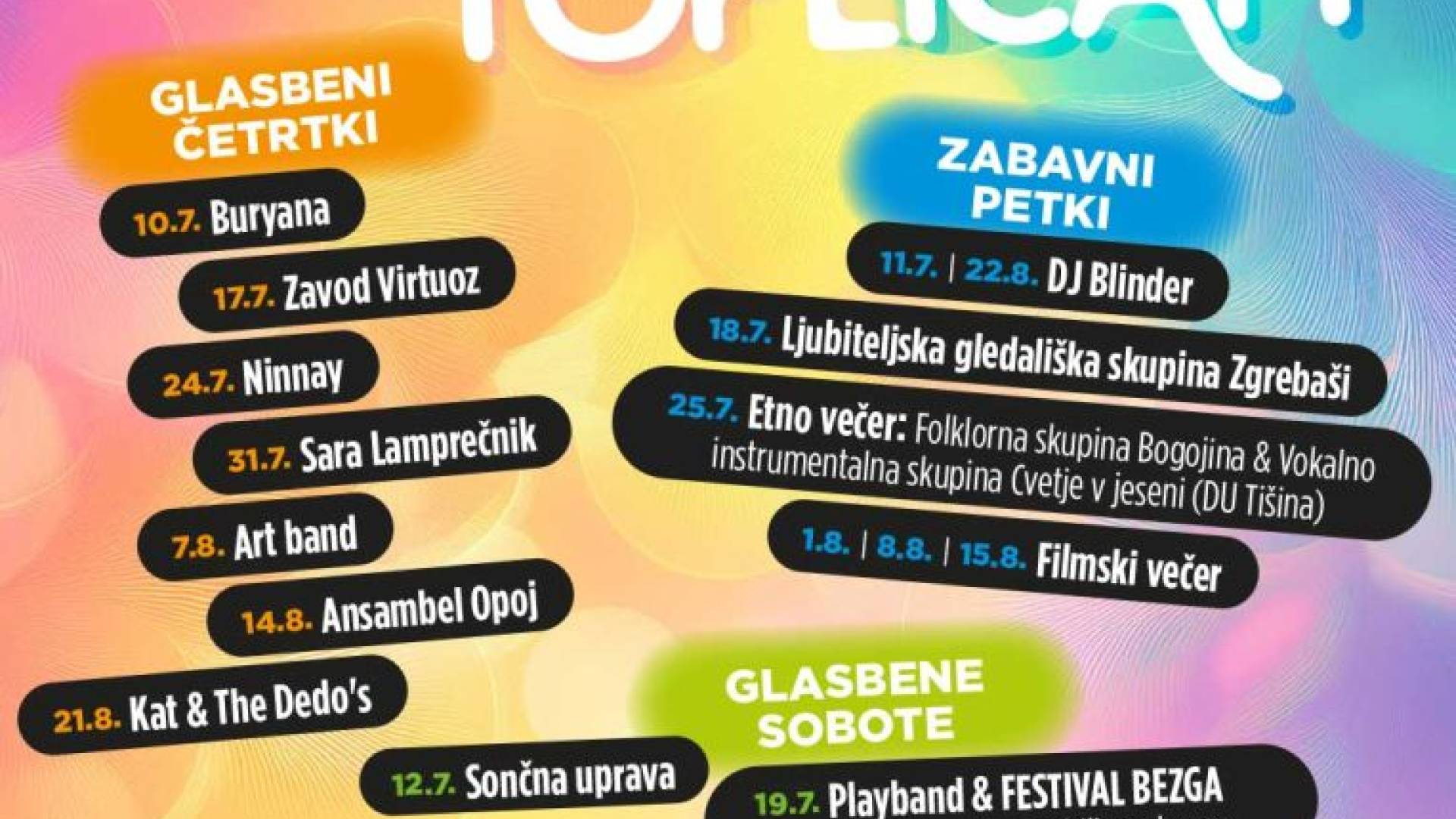 Moravske ToplicePriljubljena turistična destinacija zdravja, ravno prav velike in umirjene Moravske Toplice, se bodo v drugem tednu julija razživele z večernimi koncerti ob četrtkih in sobotah ter filmsko-kulturnimi večeri ob petkih.