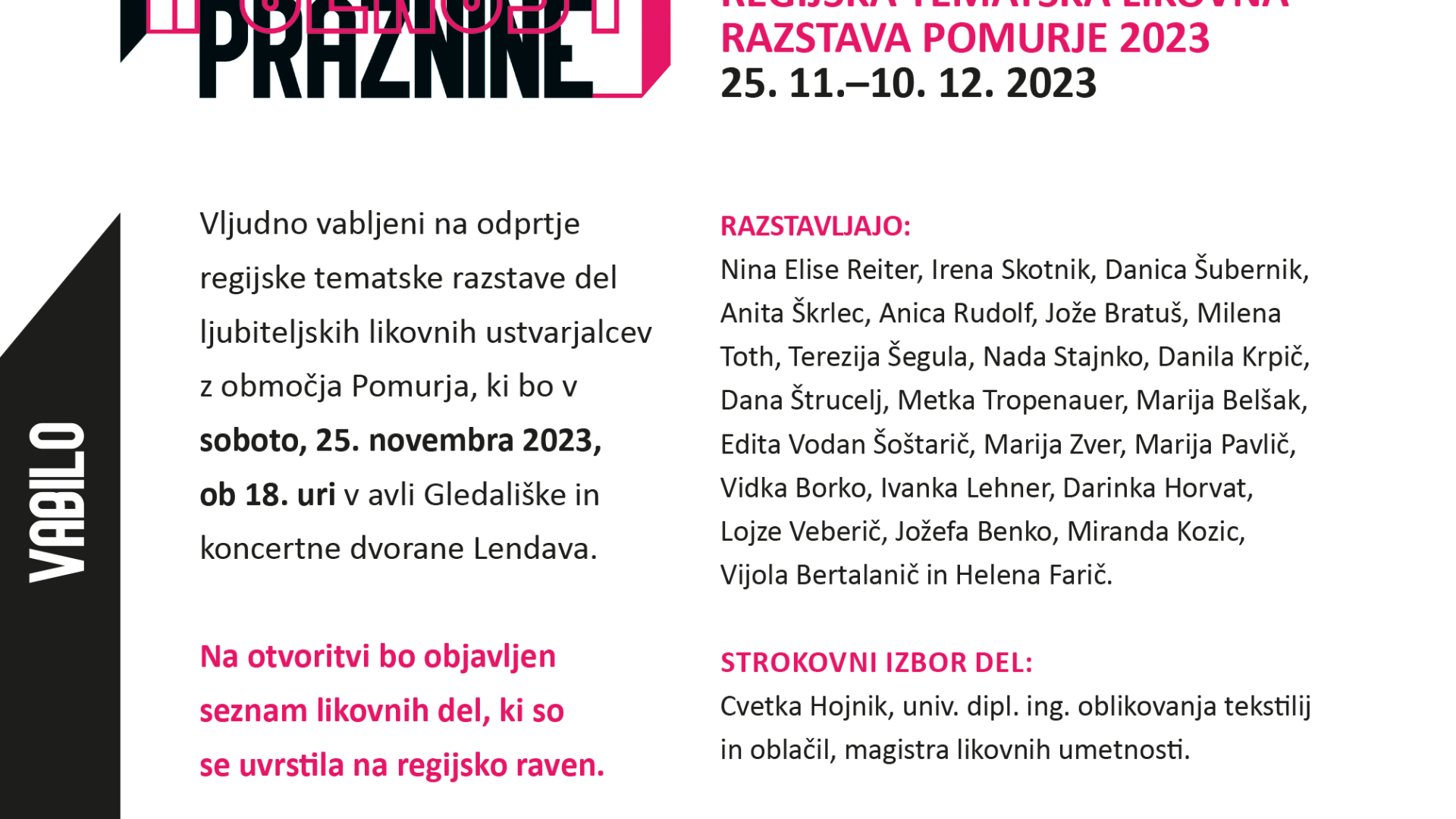 Vljudno vabljeni na odprtje regijske tematske razstave del ljubiteljskih likovnih ustvarjalcev z območja Pomurja, ki bo v soboto, 25. novembra 2023, ob 18. uri v avli Gledališke in koncertne dvorane Lendava.