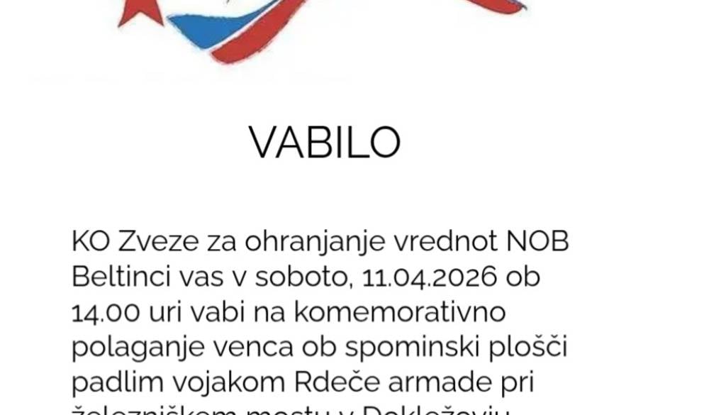 Železniški most, DokležovjeKO Zveze za ohranjanje vrednot NOB Beltinci vas v soboto, 11.4.2026 ob 14.00 uri vabi na komemorativno polaganje venca ob spominski plošči padlim vojakom Rdeče armade pri železniškem mostu v Dokležovju.