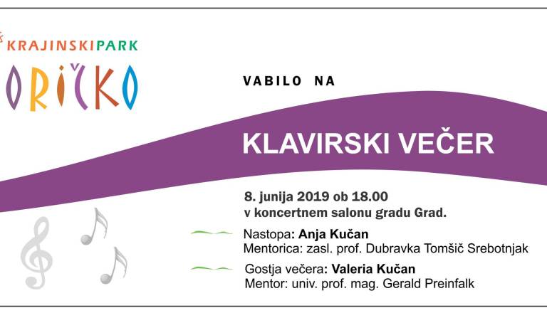 Vabljeni na KLAVIRSKI VEČER 8. junija 2019 ob 18.00 v koncertnem salonu gradu Grad. Nastopa: Anja Kučan Mentorica: zasl. prof. Dubravka Tomšič Srebotnjak Gostja ...