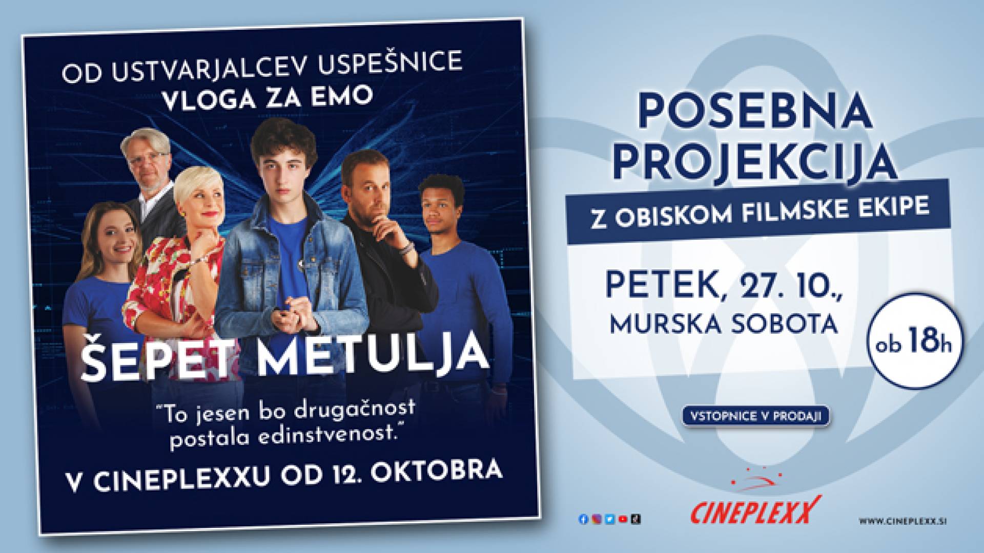 Pridruži se nam na POSEBNI PROJEKCIJI filma ŠEPET METULJA, ki bo v Cineplexxu Murska Sobota, v petek, 27. oktobra ob 18:00. Obiskala nas bo tudi ekipa in igralska zasedba!