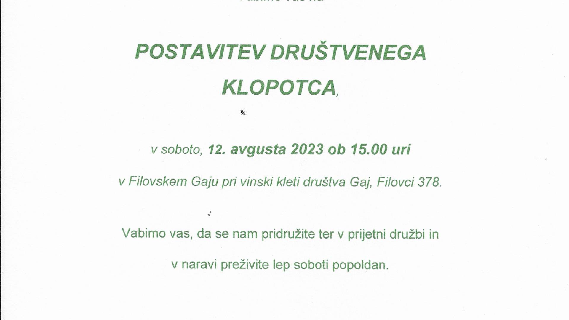 Postavitev društvenega klopotca Jana Bohar | 9. avgust 2023 12:55 v Termin Sobota, 12. avgust 2023 15:00 Lokacija Filovski Gaj Vabljeni!