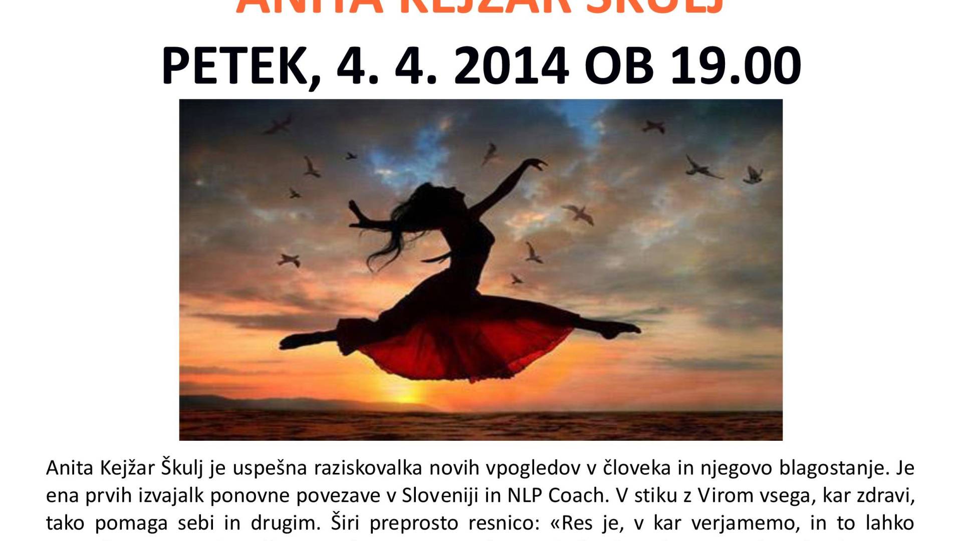 Sofija LendavaAnita Kejžar Škulj je uspešna raziskovalka novih vpogledov v človeka in njegovo blagostanje. Je ena prvih izvajalk ponovne povezave v Sloveniji in NLP Coach. V stiku z Virom vsega, kar zdravi, tako pomaga sebi in drugim. Širi preprosto resnico: " Res je, v kar verjamemo, in to lahko uresničimo ". Na dogodku nam bo spregovorila o izkušnjah iz lastne prakse, ki jih ima s ponovno povezavo, nevrolingvističnim programiranjem - NLP in frekvencami čistega Vira.