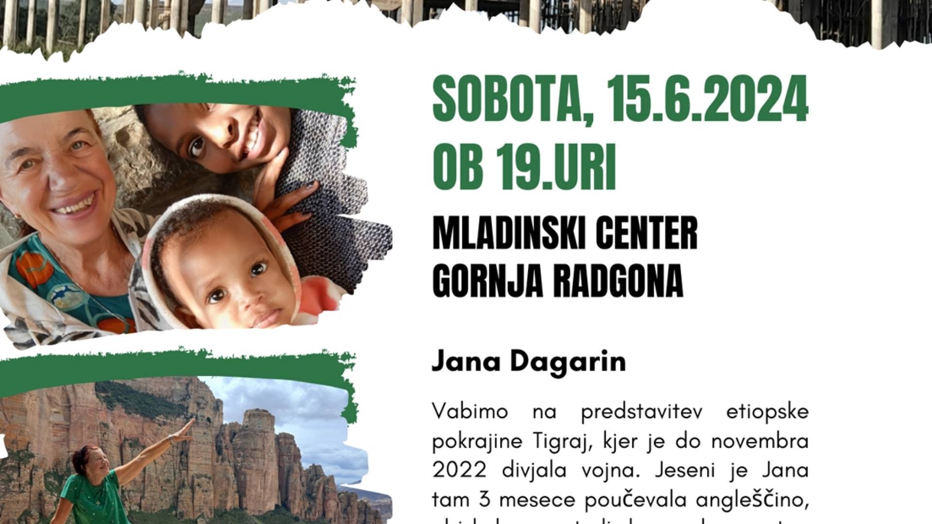 Vabimo na predstavitev etiopske pokrajine Tigraj, kjer je do novembra 2022 divjala vojna. Jeseni je Jana Dagarin tam 3 mesece poučevala angleščino, obiskala pa tudi begunske centre, vrtce in sirotišnico. Pot jo je vodila tudi v zgodovinska mesta od ostankov palače kraljice iz Sabe, do monolitskih cerkva v pečinah Gheralti.
