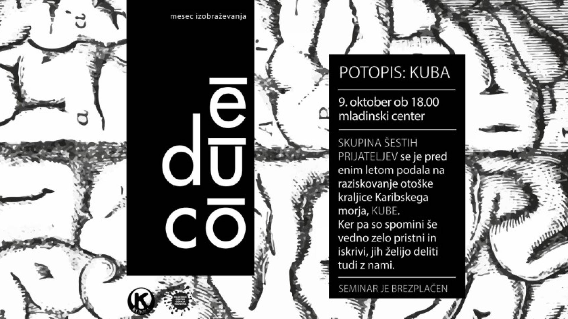 Mladinski center Gornja RadgonaV petek 9.10 bomo z mislimi za kratek čas odpotovali po Kubi. Družba šestih prijateljev se je podala na raziskovanje otoške kraljice Karibskega morja. Vabijo vas z naslednjimi besedami: ¨Od našega raziskovanja Kube je minilo že več kot eno leto, vendar so spomini še vedno pristni in iskrivi. Ker smo to poletje bili primorani ostati doma, se nam pridruži pri podoživljanju naših Kubanskih avantur.