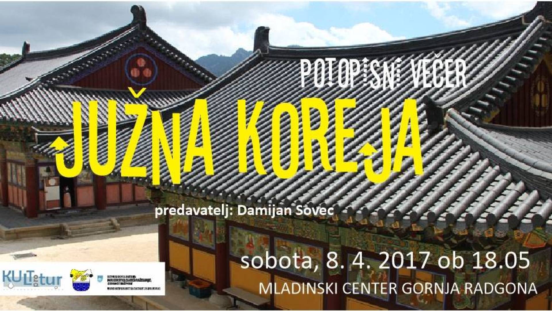 Mladinski center Gornja RadgonaŠe pred začetkom popotniške sezone nas bo Damijan Sovec s sliko in besedo popeljal v Južno Korejo. Vabljeni v soboto, 8. aprila 2017, ob 18.05 v Mladinski center Gornja Radgona.