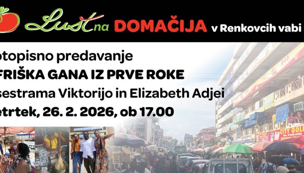 Luštna domačija RenkovciVabimo vas na zanimivo in doživeto potopisno predavanje sester Viktorije in Elizabeth Adjei, ki sta v svojem prvem obisku Gane, od koder so njune korenine, v afriški deželi preživeli tri tedne, spoznali družino, lokalne posebnosti in kulturo ter se naučili priprave osnovnih jedi, značilne za Gano. Raziskovali sta tudi naravne posebnosti in znamenitosti. Ker je njun oče nogometaš sta bili med potovanjem pogosto obdani z njegovimi prijatelji nogometaši. Ta povezava jima je omogočila, da sta obiskali svetovno znanega nogometaša Kwameja Ayewa Stocka, člana ganske reprezentance, imenovane Black Stars.