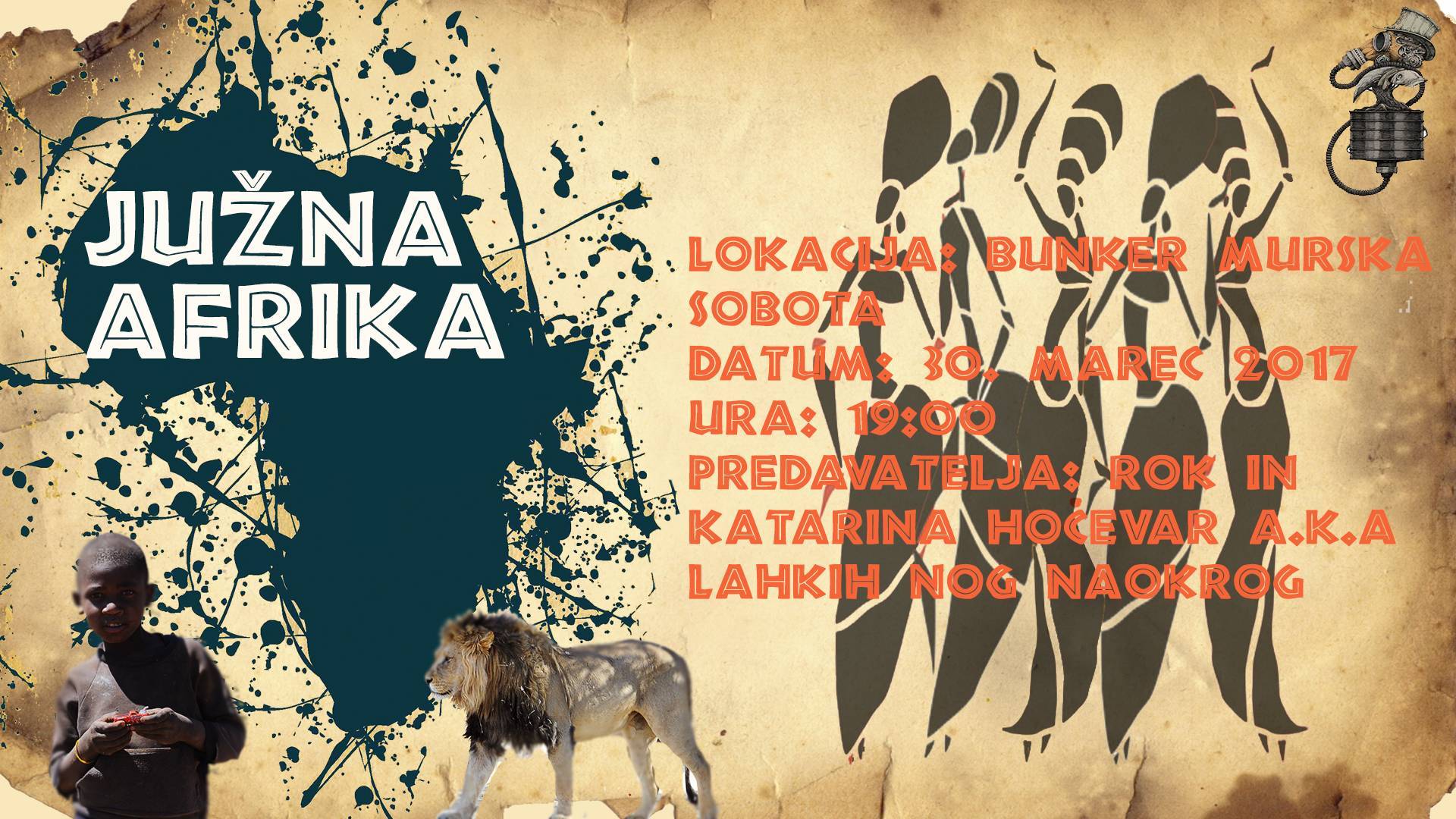 Bunker Murska SobotaNa potopisnem predavanju se bomo odpravili na jug Afrike, natančneje v Južnoafriško republiko, Lesoto in Svazi, na hitro pa bomo pokukali še v Bocvano in Namibijo. Z najetim terencem nas bosta Rok in Katarina popeljala po vseh lepotah tega dela sveta: od puščave preko visokih gora do oceana, in potem nazaj od oceana preko kanjonov do savan. Spoznali bomo afriške divje živali, srečali najbolj prijazne in vedno nasmejane ljudi, se vzpeli na impozanten in tudi izredno zahteven vrh v Zmajevih gorah, se branili pred opicami in škorpijoni ter opazovali najlepše sončne zahode. Pot pa bomo zaključili v sproščenem Cape Townu, kjer v morju kraljujejo beli morski psi, zaledje pa je polno vinorodnih gričkov ter vinskih kleti z vrhunskim vinom.