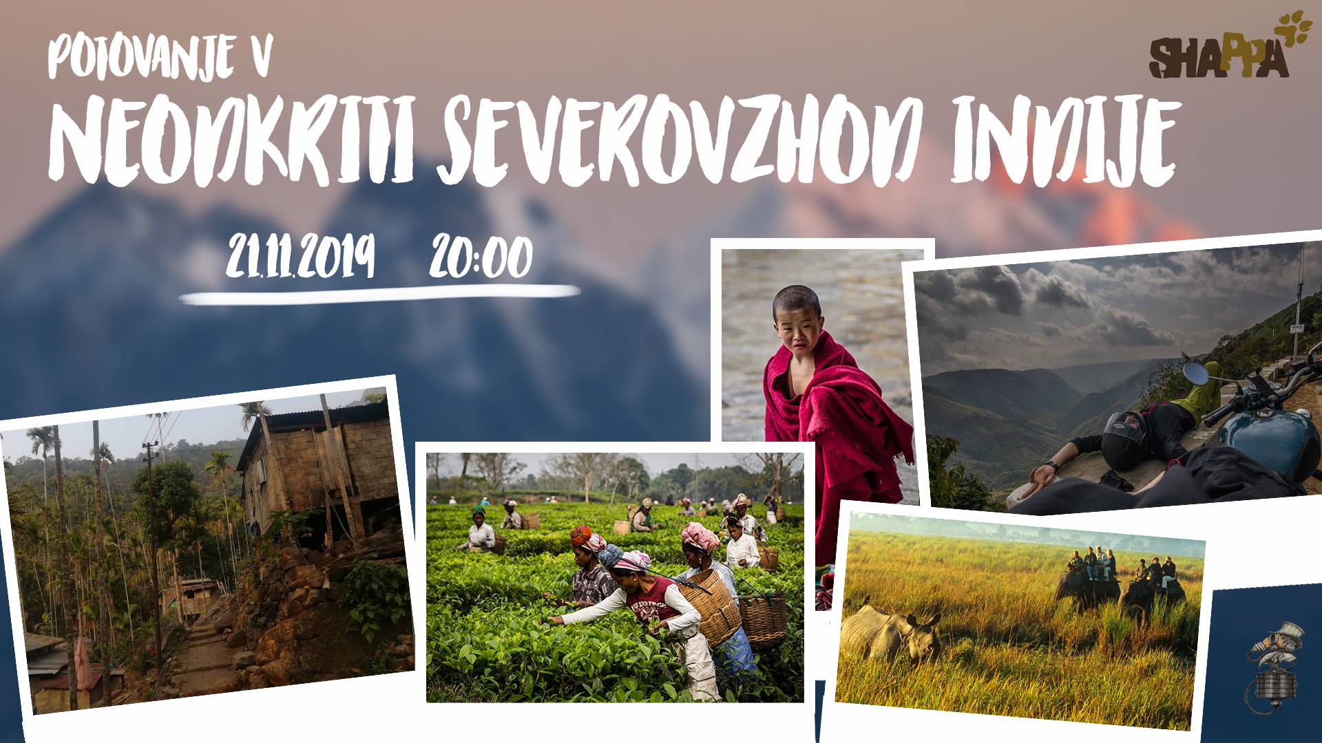 Na tokratnem potopisu nam bo predstavljeno potovanje skozi vasice Khasijev, po najbolj vlažnem in zelenem podeželju Meghalaye, safari za Indijskimi nosorogi iz slonjega hrbta v Unescovem parku Kaziranga, raziskovanje največjega rečnega otoka na svetu - Majulija, prečkanje 4200m visokega prelaza skozi Himalajo v oddaljene dolino Tawang, kjer domuje 2. največji budistični samostan in ljudje z največjimi nasmehi - Monpe ter obisk Adamanskih otokov, ki so raj za vse ljubitelje rajskih plaž, romantike in joge.