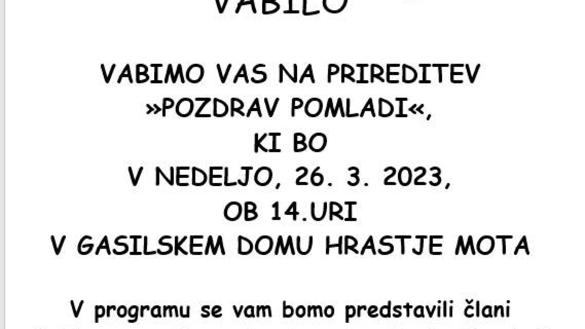 Pozdrav pomladi Jana Bohar | 22. marec 2023 09:11 v Termin Nedelja, 26. marec 2023 14:00 Lokacija Gasilski dom Hrastje Mota Lepo vabljeni!
