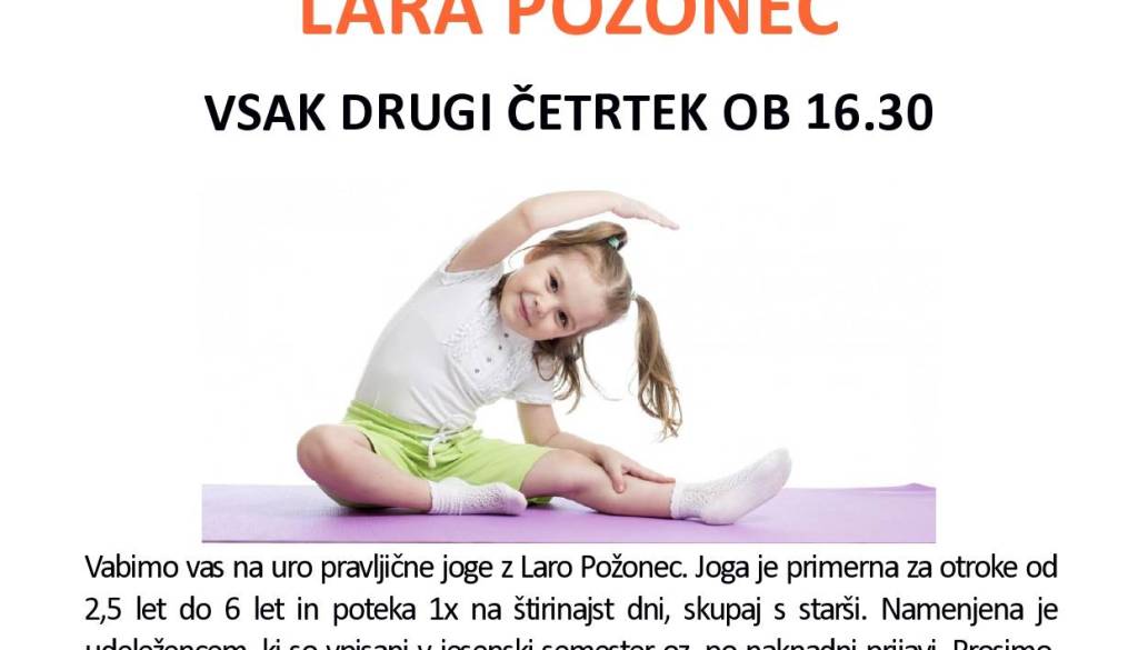 Sofija medgeneracijska hiša Lendava Glavna ulica 48 9220 LendavaJoga je primerna za otroke od 2,5 let do 6 let /do 5. leta v spremstvu staršev/. Namenjena je udeležencem, ki so vpisani v jesenski semester oz. po naknadni prijavi. Prosimo, prinesite s seboj telovadno podlogo in flaško vode. Potrebne so predhodne prijave.