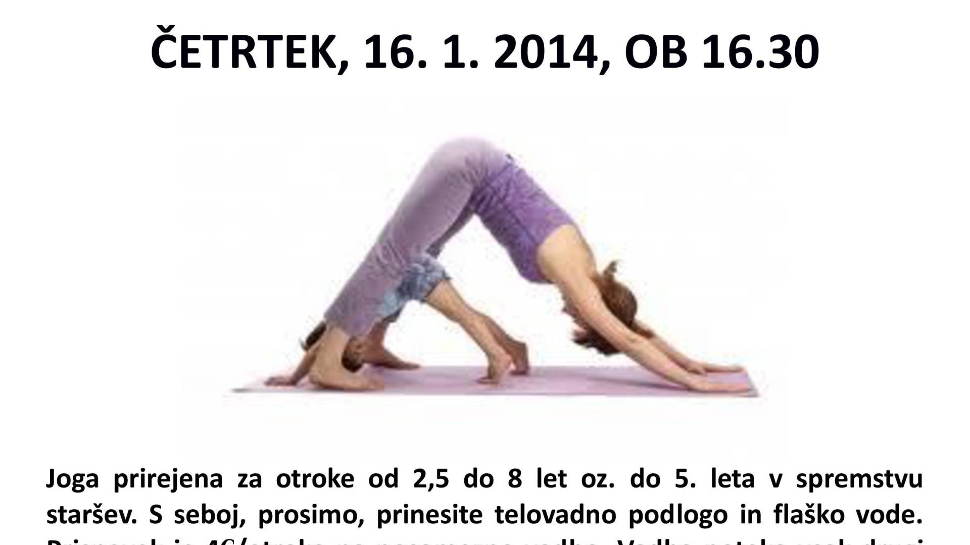 Sofija Lendava~~Joga za otroke od 2,5 let do 6 let /do 5. leta v spremstvu staršev/. Prosimo prinesite s seboj telovadne podloge. Potrebne so predhodne prijave zaradi omejenega števila mest. Prispevek 4€ na otroka.