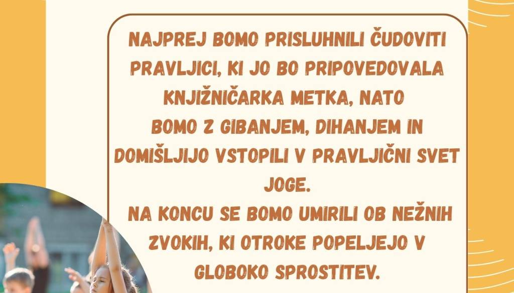 Pokrajinska in študijska knjižnica Murska SobotaNajprej bomo prisluhnili čudoviti pravljici, ki jo bo pripovedovala knjižničarka metka, nato bomo z gibanjem, dihanjem in domišljijo vstopili v pravljični svet joge. Na koncu se bomo umirili ob nežnih zvokih, ki otroke popeljejo v globoko sprostitev.