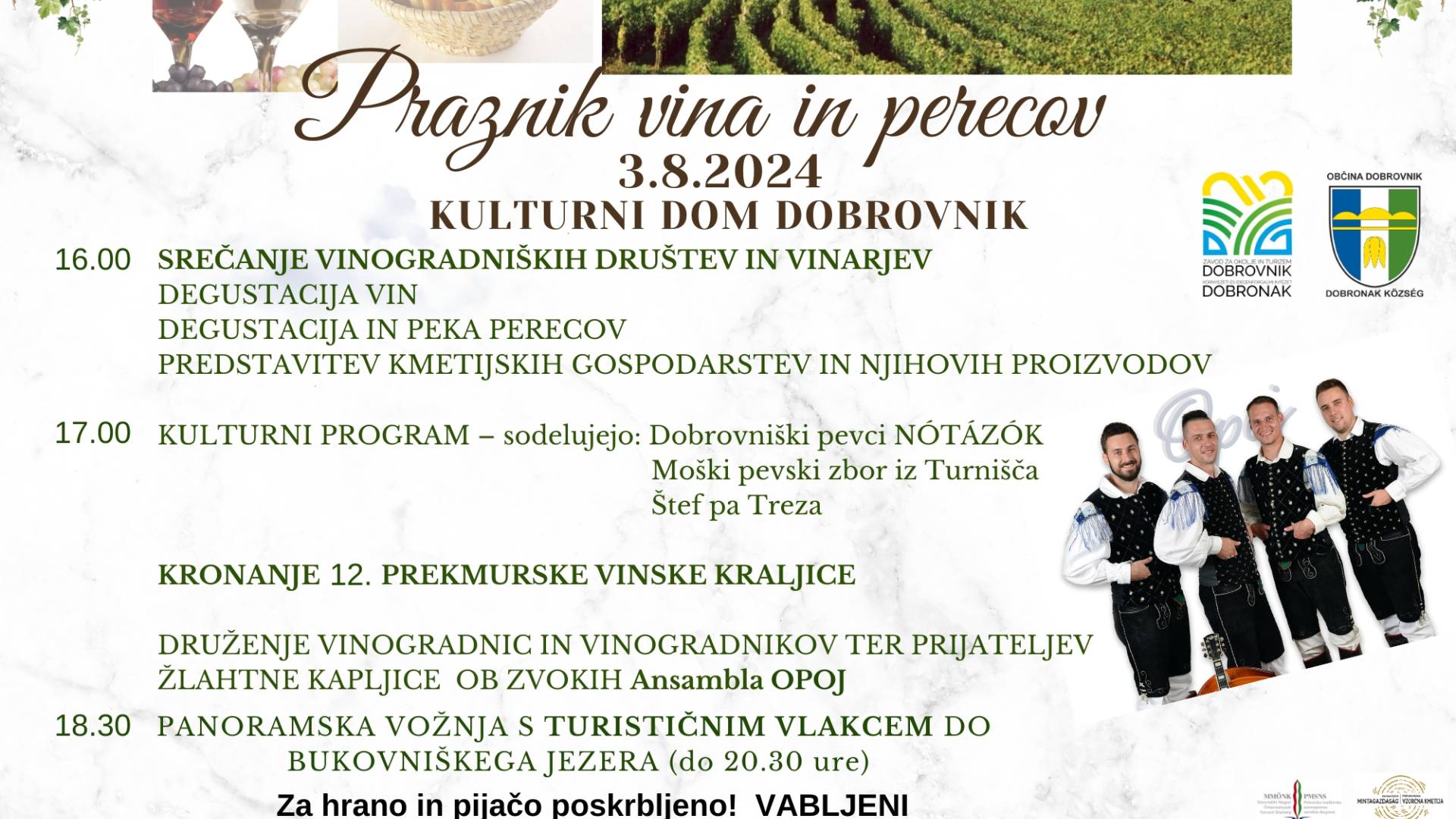 Dobrovnik - kulturni domVabljeni na tradicionalno prireditev Praznik vina in perecov v soboto, 3. avgusta 2024 ob 16.00 uri. Dogodek bo popestrilo kronanje 12. Prekmurske vinske kraljice. Za dobro vzdušje bo poskrbel ansambel OPOJ.
