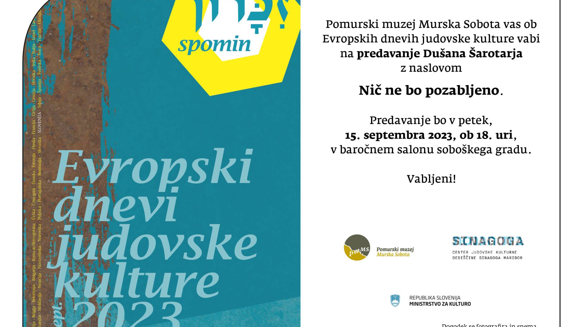 Pomurski muzej Murska SobotaPomurski muzej Murska Sobota vas ob Evropskih dnevih judovske kulture vabi na predavanje Dušana Šarotarja z naslovom Nič ne bo pozabljeno.
