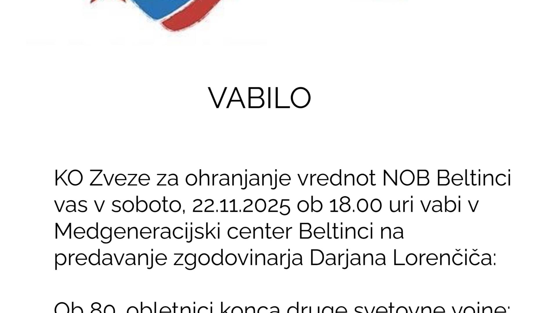 Medgeneracijski center BeltinciKO Zveze za ohranjanje vrednot NOB Beltinci vas v soboto, 22.11.2025 ob 18.00 uri vabi v Medgeneracijski center Beltinci na predavanje zgodovinarja Darjana Lorenčiča: Ob 80. obletnici konca druge svetovne vojne: spomini na prihod Rdeče armade.