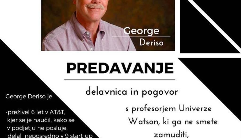 Grajska dvorana Murska SobotaDruštvo Ustvarjalnik, pospeševalnik mladinskega podjetništva 2. 7. 2016 ob 18.00 uri vabi na predavanje (delavnico in pogovor) z Georgeem Derisom na temo »Perspektive regije«.