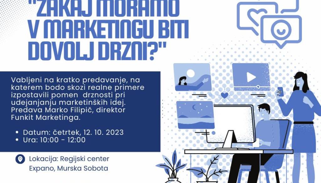 Regijski center EXPANOV okviru letošnjega projekta PROMOCIJA VD POMURJE 2023, ki ga sofinancira 16 pomurskih občin, prirejamo izobraževalni dogodek oziroma predavanje na temo pomena drznosti pri udejanjanju marketinških idej.