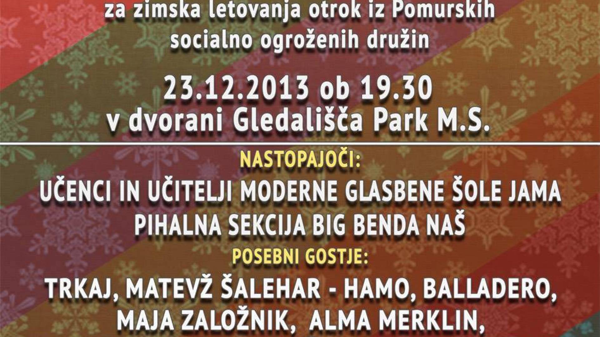 Gledališče Park Murska SobotaModerna glasbena šola JAMA v Murski Soboti ter LEO CLUB Murska Sobota vabita na predbožični dobrodelni koncert. Sredstva od prodanih vstopnic, bodo v CELOTI namenjena za pokritje stroškov zimskih letovanj otrok iz socialno ogroženih družin v pomurju. NASTOPAJOČI: Učenci glasbene šole JAMA, Naš big band Ljutomer, mentorji glasbene šole JAMA, BALLADERO, HAMO ( HAMO IN TRIBUTE2LOVE), TRKAJ, ALMA MERKLIN, MAJA ZALOŽNIK ter mnogi drugi. Prireditev bosta povezovala priznana prekmurska komedijanta; MIRAN CAMPLIN IN PRIMOŽ DANI. cena vstopnice 5 EUR ; PRODAJNA MESTA; Blagajna Gledališča Park, moderna glasbena šola JAMA ( Cankarjeva ulica 25, MS )