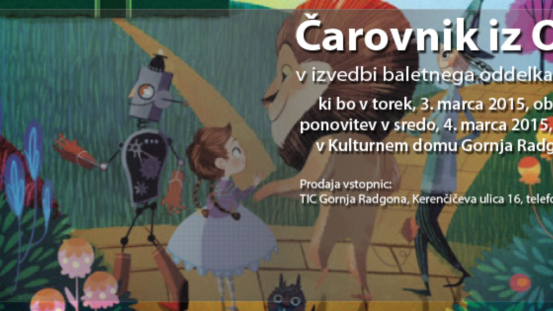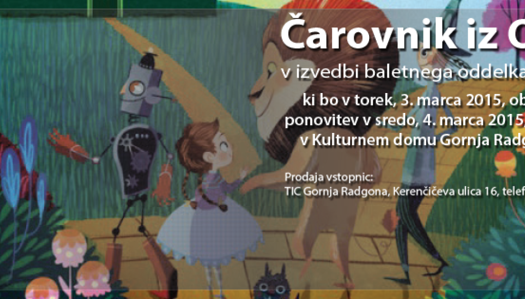 Kulturni dom Gornja RadgonaVabimo vas na predstavo Čarovnik iz Oza, v izvedbi baletnega oddelka GŠGR. Predstava bo potekala, 3. marca 2015, ob 18. uri, v Kulturnem domu Gornja Radgona.