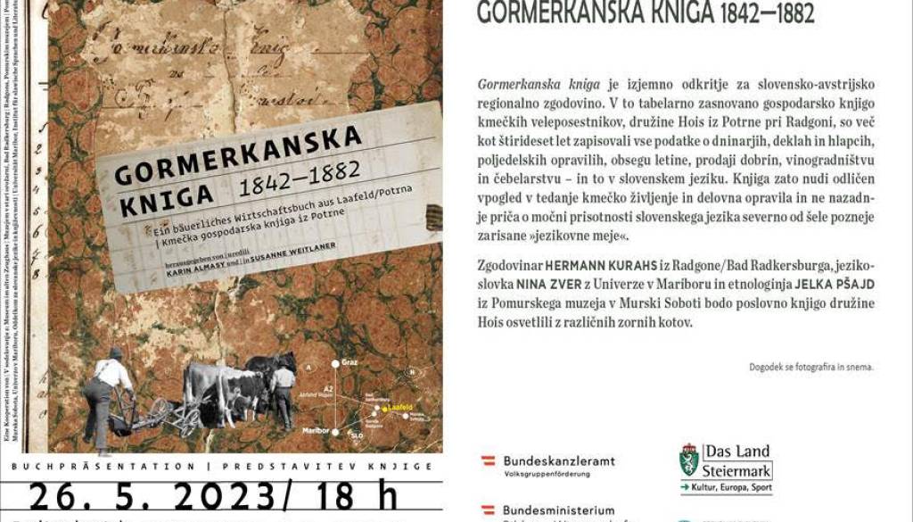 Pomurski muzej Murska SobotaVabljeni na predstavitev Gormerkanske knige 1842-1882, pisane v dajnčici in gajici, soavtoric Jelke Pšajd in Nine Zver, ki bo v Pomurskem muzeju v petek, 26. 5. 2023, ob 18. uri.