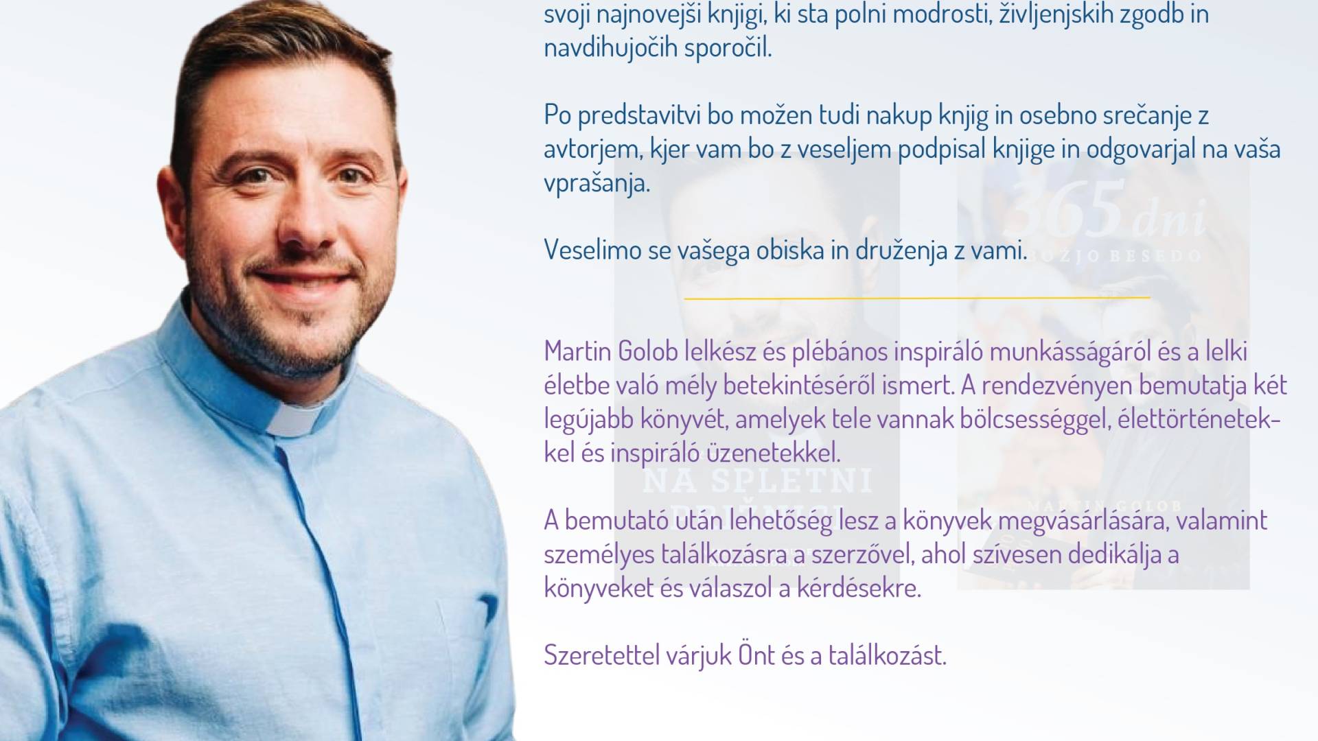 Župnik Martin Golob je znan po svojem navdihujočem delu in globokem vpogledu v duhovno življenje. Na dogodku bo predstavil svoji najnovejši knjigi, ki sta polni modrosti, življenjskih zgodb in navdihujočih sporočil. Po predstavitvi bo možen tudi nakup knjig in osebno srečanje z avtorjem, kjer vam bo z veseljem podpisal knjige in odgovarja na vaša vprašanja.