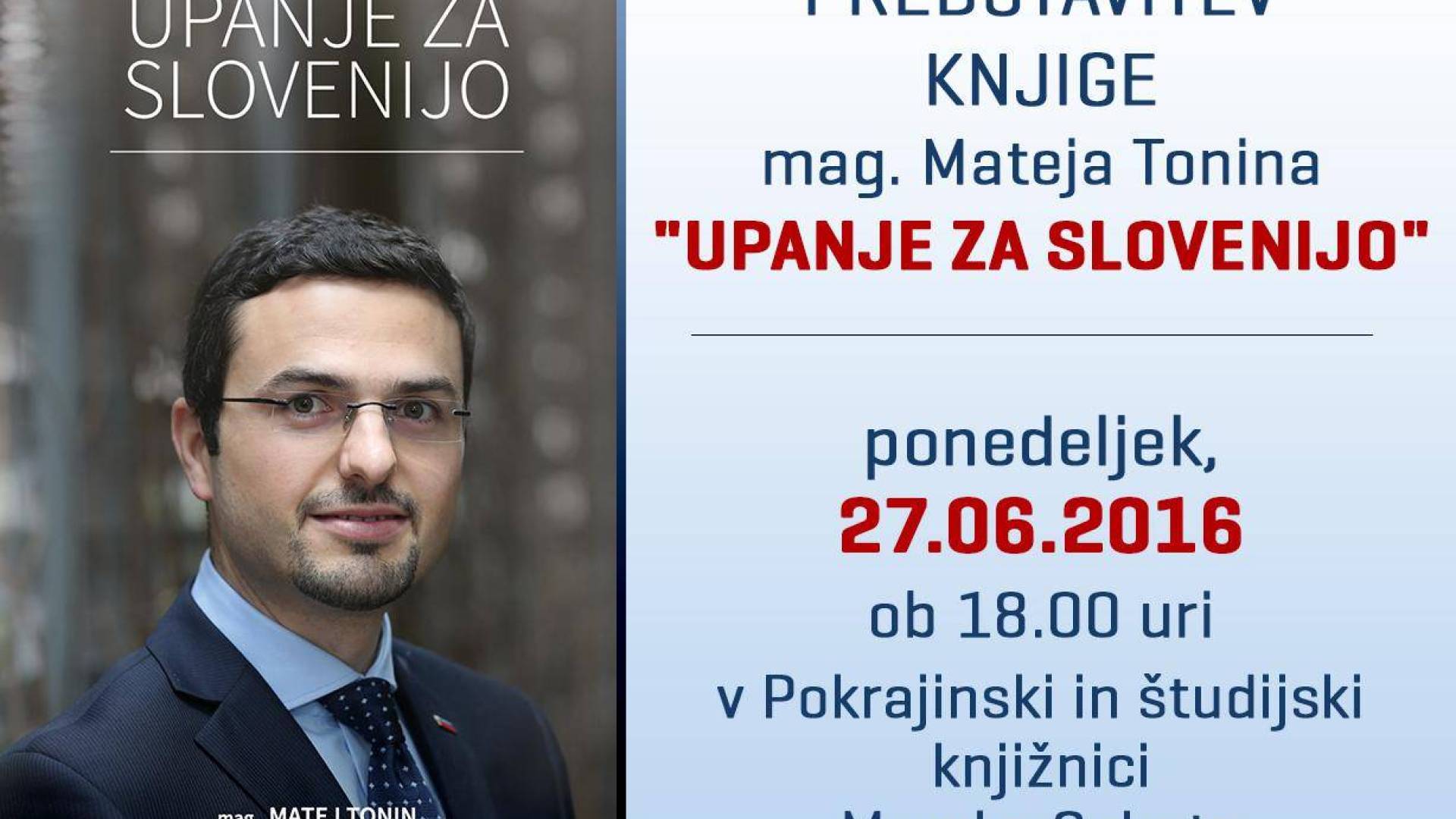 Pokrajinska in študijska knjižnica Murska SobotaV ponedeljek, 27. 6. 2016, ob 18.00 uri bo v Pokrajinski in študijski knjižnici Murska Sobota potekala Predstavitev knjige Mateja Tonina "Upanje za Slovenijo".