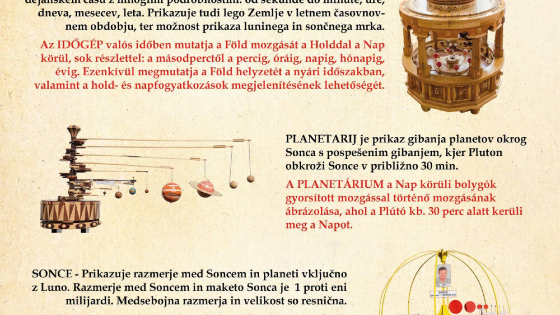Gibanje Zemlje z Luno okrog Sonca v resničnem času z mnogimi podrobnostmi: od sekunde do minute, ure, dneva, mesece, leta. Obenem prikazuje lego Zemlje v letnem časovnem obdobju, ter možnost prikaza Luninega in Sončevega mrka. Sestavljeno je iz 3500 delov katerega še vedno dopolnjuje z novimi deli.