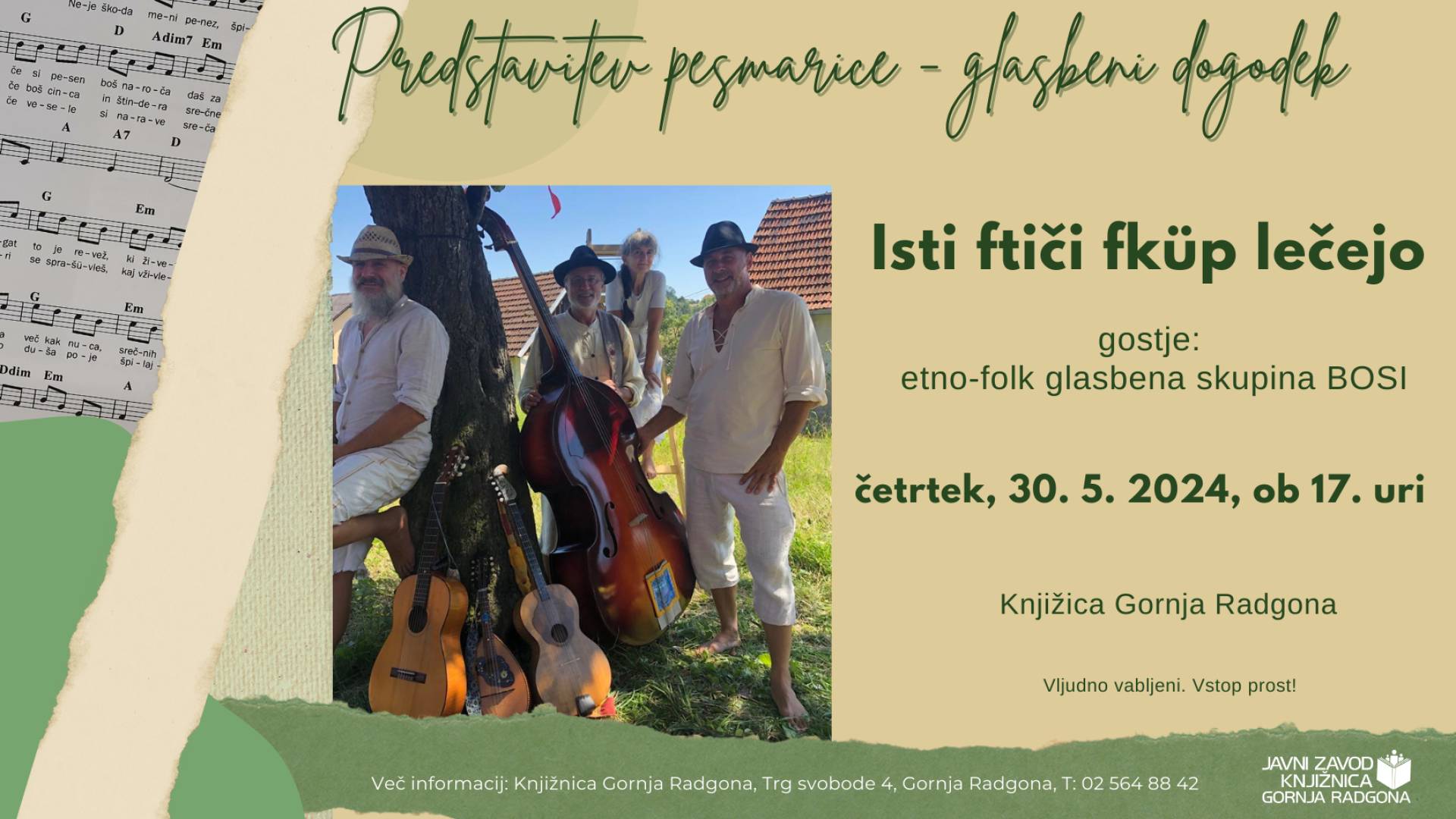 JZ Knjižnica Gornja RadgonaVljudno vabljeni na literarno-glasbeni večer etno-folk glasbene skupine Bosi. Člani skupine bodo nam predstavili pesmarico Isti ftiči fküp lečejo in nam tudi zaigrali. Obeta se zabaven pomladni večer, ki bo v četrtek, 30. 5. 2024, ob 17. uri v Knjižnici Gornja Radgona, Trg svobode 4, Gornja Radgona.