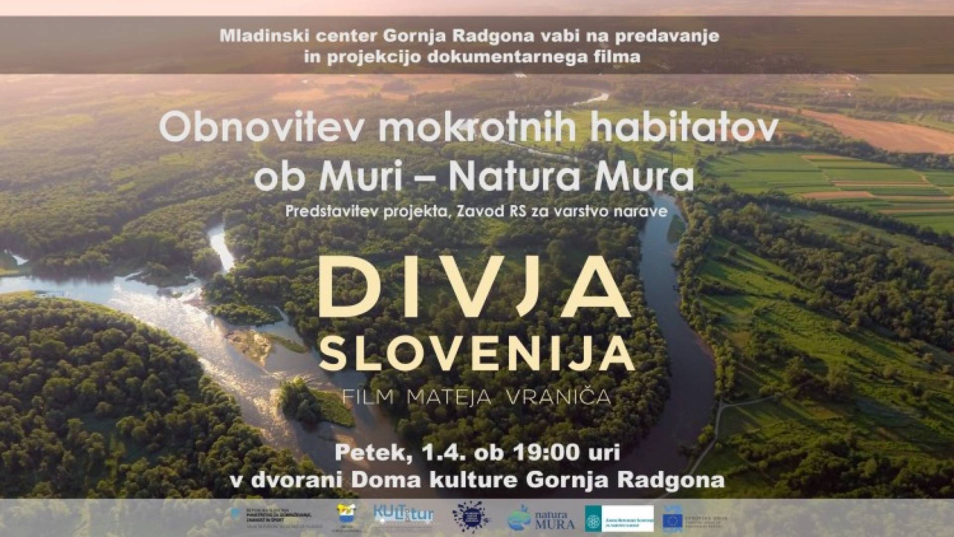 Dom kulture Gornja RadgonaMladinski center Gornja Radgona vabi na predstavitev projekta Obnovitev mokrotnih habitatov ob Muri – Natura Mura in projekcijo dokumentarnega filma Divja Slovenija, ki bo v petek, 1. aprila 2022, ob 19. uri, v dvorani Doma kulture Gornja Radgona.
