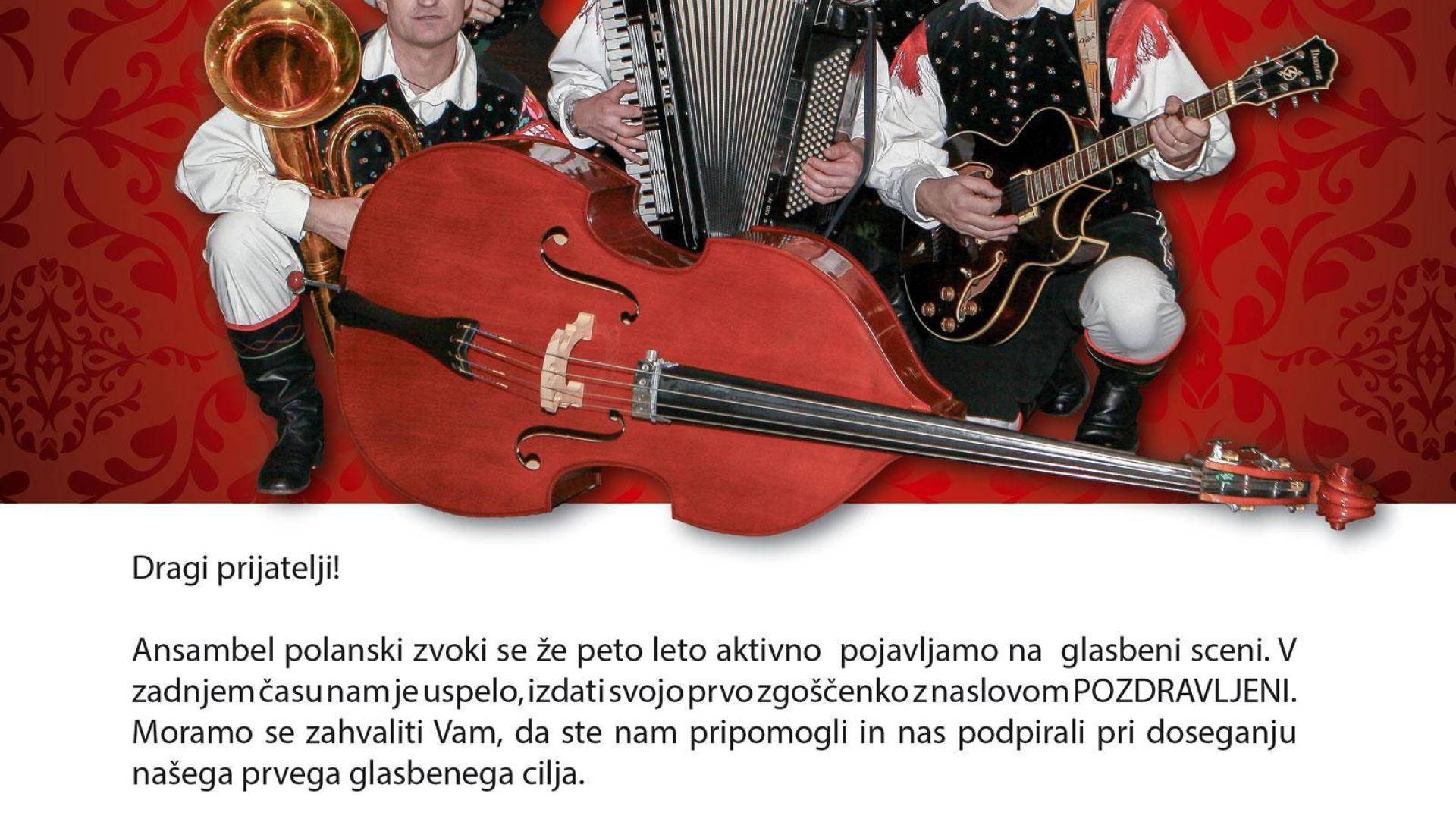 Ansambel polanski zvoki vas prisrčno vabi, da se v nedeljo, 17. maja 2015 ob 18.00 v dvorani Doma krajanov v Veliki Polni udeležite predstavitve njihove prve zgoščenke z naslovom POZDRAVLJENI, ter jih s svojim obiskom in lepimi glasbenimi spomini na dogodek ponesete širom po Sloveniji, mogoče tudi čez mejo.