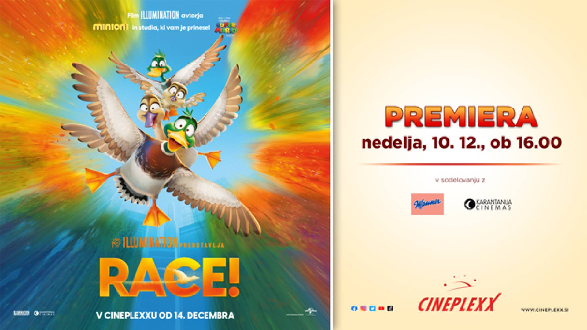 V kinu Cineplexx (Maximus) v Murski SobotiPridruži se na premieri animirane komedije RACE!, ki bo v vseh naših Cineplexxih, že v nedeljo, 10.12.2023, ob 16:00!