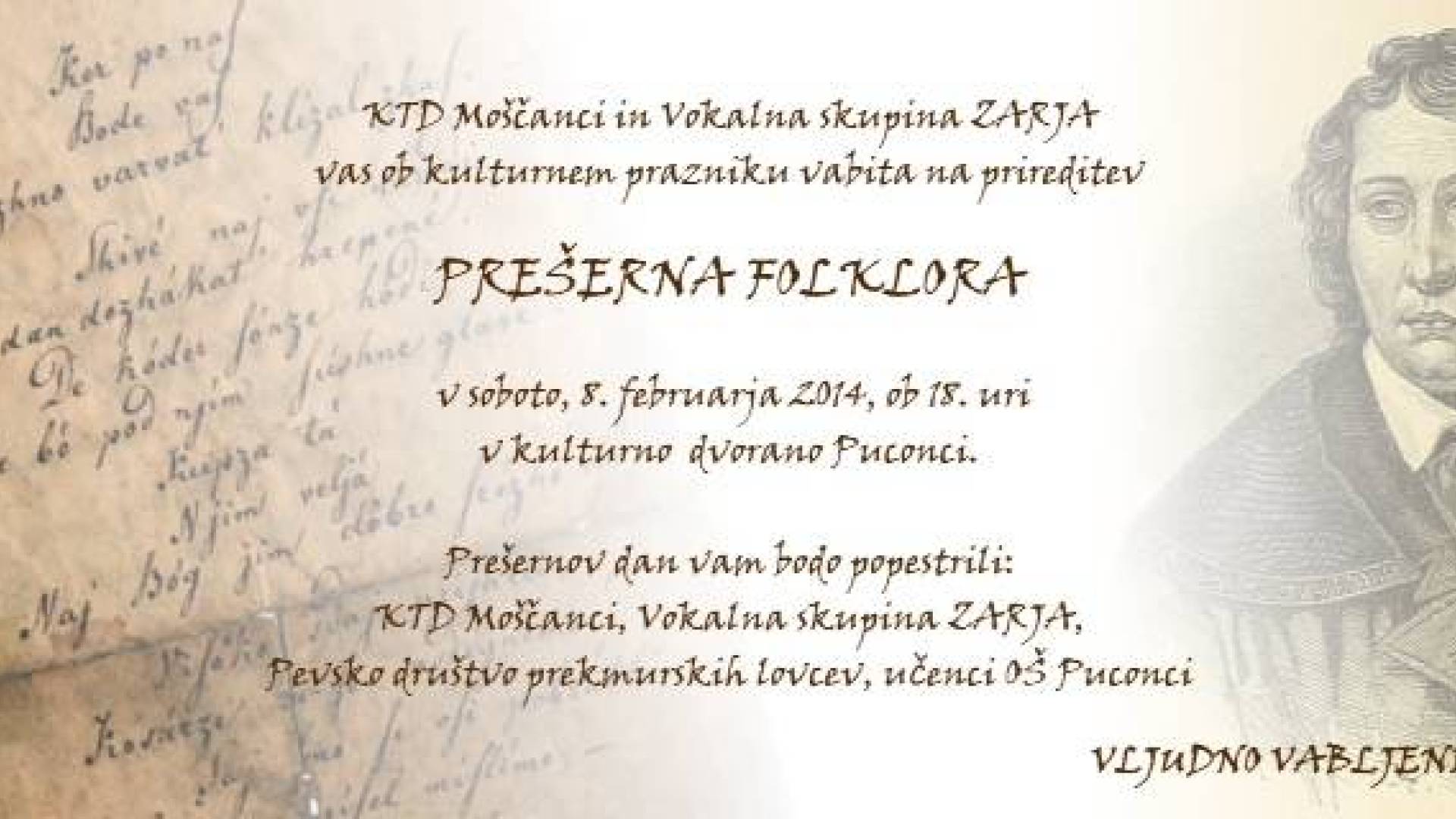 Kulturna dvorana PuconciKTD Moščanci in Vokalna skupina Zarja vabita na prireditev PREŠERNA FOLKLORA, ki bo v soboto, 8.2., ob 18. uri v kulturni dvorani v Puconcih.