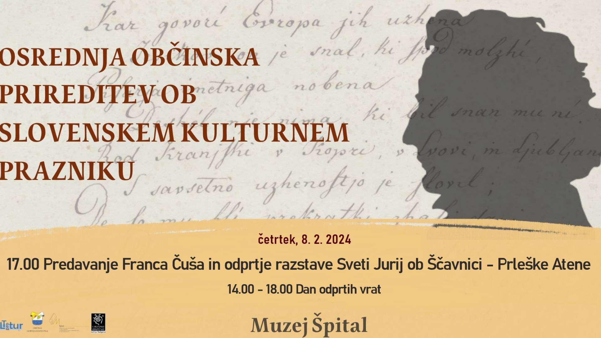 Muzej Špital v Gornji RadgoniTudi ob letošnjem kulturnem prazniku vas vabimo, da ga preživite v družbi kulture. Špital ponovno na široko odpira svoja vrata in vabi k brezplačnemu ogledu in raziskovanju zakladov, ki jih skriva v sredo, 8. 2. 2024, med 14. in 18. uro, ob 17. uri pa na predavanje Franca Čuša in odprtje razstave Sveti Jurij ob Ščavnici - Prleške Atene.