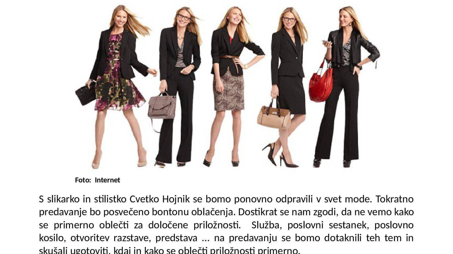 S slikarko in stilistko Cvetko Hojnik se bomo ponovno odpravili v svet mode. Tokratno predavanje bo posvečeno bontonu oblačenja. Dostikrat se nam zgodi, da ne ...