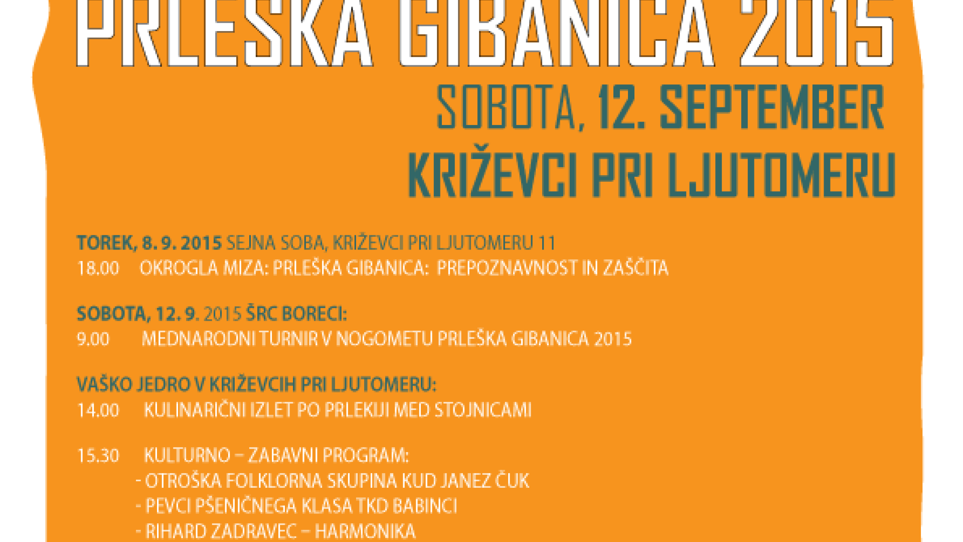 V soboto, 12. septembra 2015, se v Križevcih pri Ljutomeru obeta zelo okusen dogodek PRLEŠKA GIBANICA 2015 s kulinaričnim izletom po Prlekiji med stojnicami in bogatim kulturno-zabavnim programom.