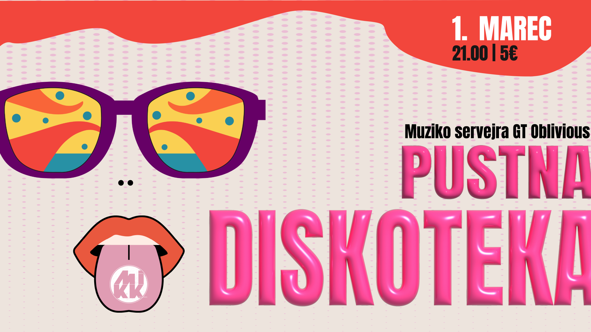 Tradicionalna MIKKova pustna diskoteka, odlična plesna glasba in klubska atmosfera, najbolj nore in neverjetne maske ter druženje z ljudmi, ki jih že nekaj časa niste srečali. Verjetno jih tokrat ne boste nekaj časa niti prepoznali, ker bodo vsi tako ali tako zamaskirani. Dovolite si biti, kar si potihoma želite postati čez vse leto in plešite.