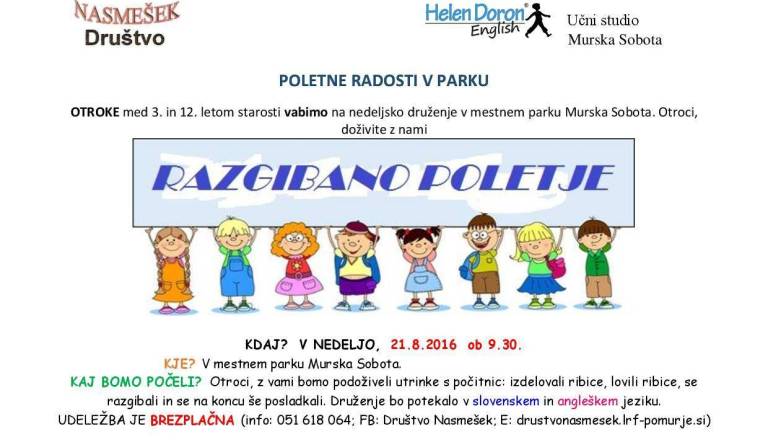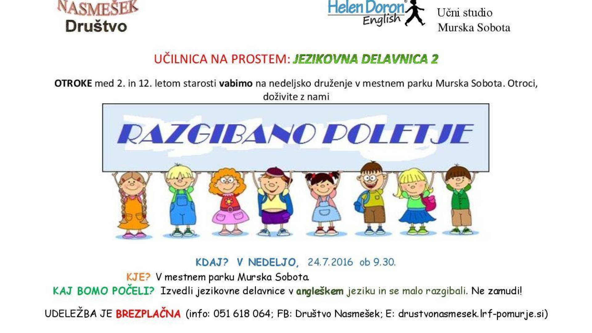 Mestni park Murska SobotaDruštvo Nasmešek, v sodelovanju s Helen Doron, pripravlja že drugo jezikovno delavnico. Delavnica bo potekala v nedeljo, 24. 7., z pričetkom ob 9.30. Poleg delavnice angleškega jezika, pripravljamo še razne igre ob katerih se bomo razgibali. Aktivnosti so namenjene otrokom od 2. do 12. leta starosti.