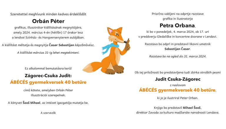 Avla gledališke in koncertne dvorane LendavaVljudno vabljeni na otvoritev razstave likovnih del iz županije Zala, ki bo v četrtek, 11. januarja 2024, ob 18. uri v avli Gledališke in koncertne dvorane Lendava.