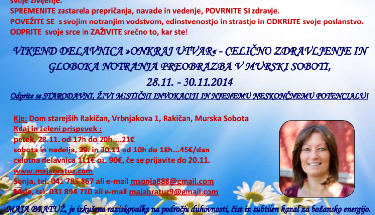 Vikend delavnica "Onkraj utvar" - celično zdravljenje in globoko notranja preobrazba v Murski Soboti 28.11 - 30.11.2014 Dom starejših Rakičan, Vrbnjakova 1 ...