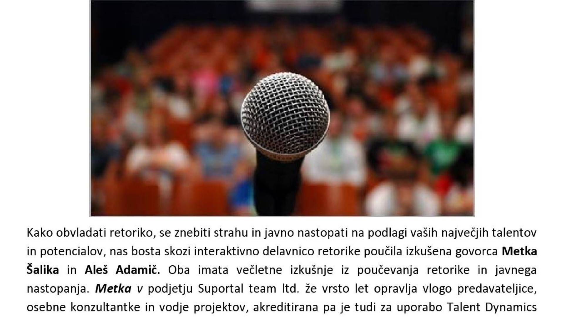Kako obvladati retoriko, se znebiti strahu in javno nastopati na podlagi vaših največjih talentov in potencialov, nas bosta skozi interaktivno delavnico retorike poučila izkušena govorca Metka Šalika in Aleš Adamič. Oba imata večletne izkušnje iz poučevanja retorike in javnega nastopanja. Metka v podjetju Suportal team ltd. že vrsto let opravlja vlogo predavateljice, osebne konzultantke in vodje projektov, akreditirana pa je tudi za uporabo Talent Dynamics metodologij kot Flow consultant and Step 1 Performance Consultant. Aleš je svoje izkušnje iz gospodarstva, ki si jih je nabral v Angliji, združil z zanimanjem za človeški potencial in deluje na področju podjetniškega svetovanja in coachinga talentov ter potenciala kadrov.