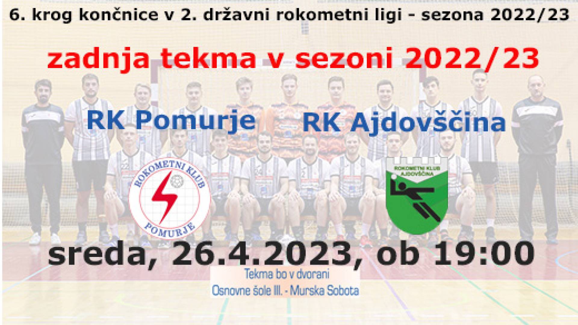 Športna dvorana OŠ III Murska SobotaV sredo, pred prazniki še zadnja članska tekma v sezoni 2022/23. Gostje so si že zagotovili uvrstitev v 1B ligo.