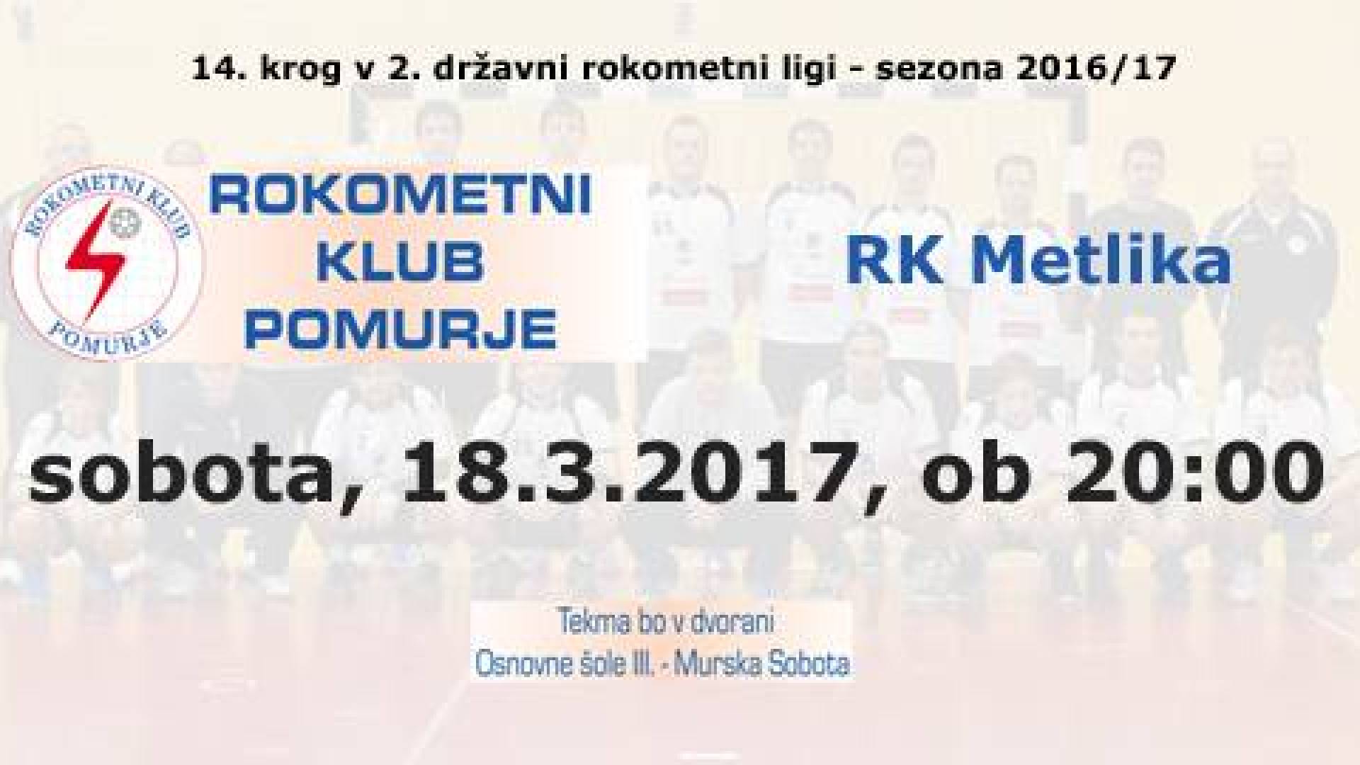 Športna dvorana OŠ III Murska SobotaTekma 14. kroga v 2. DRL za moške Po visoki zmagi v prejšnjem krogu prihaja v Mursko Soboto mlada ekipa Metlike s katero imajo Prekmurci neporavnane račune, saj so jih v Metliki premagali za 9 zadetkov.