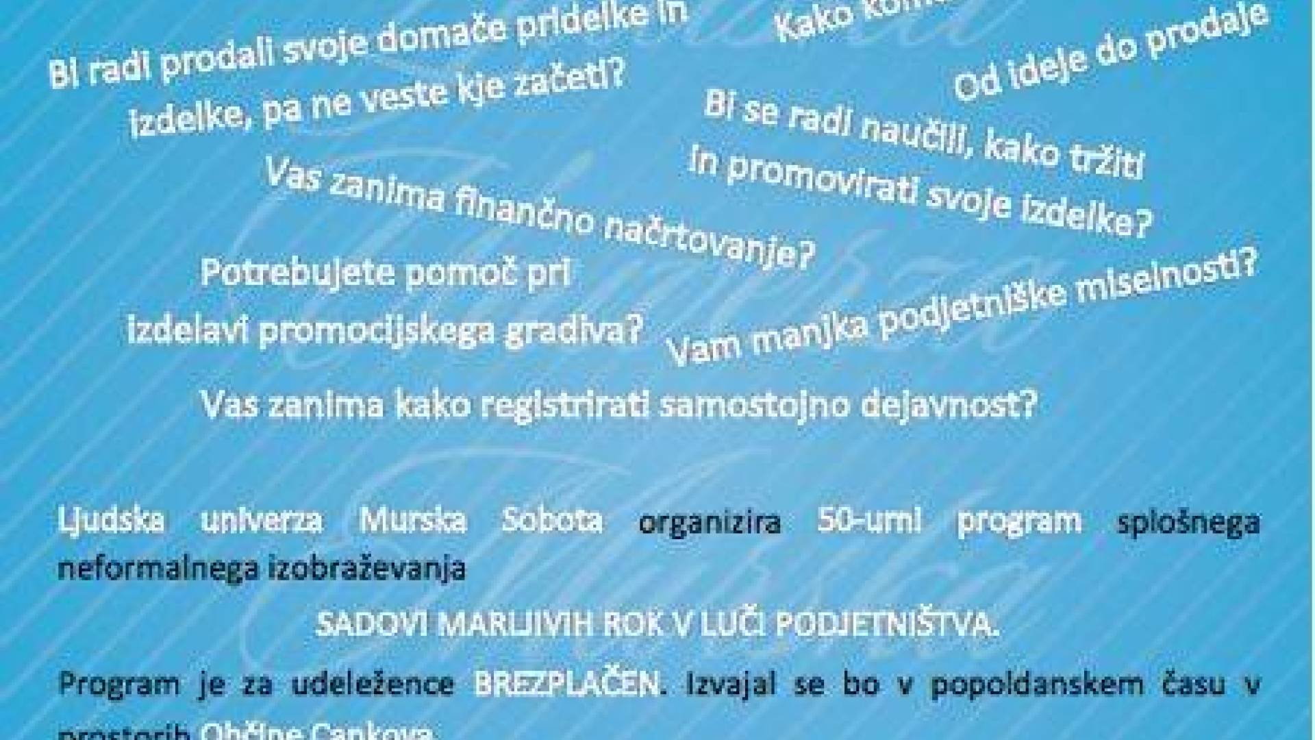 Ljudska univerza Murska Sobota organizira program splošnega neformalnega izobraževanja Sadovi marljivih rok v luči podjetništva. Program se bo izvajal v popoldanskih urah v prostorih Občine Cankova, trajal bo 50 ur in je za udeležence brezplačen.