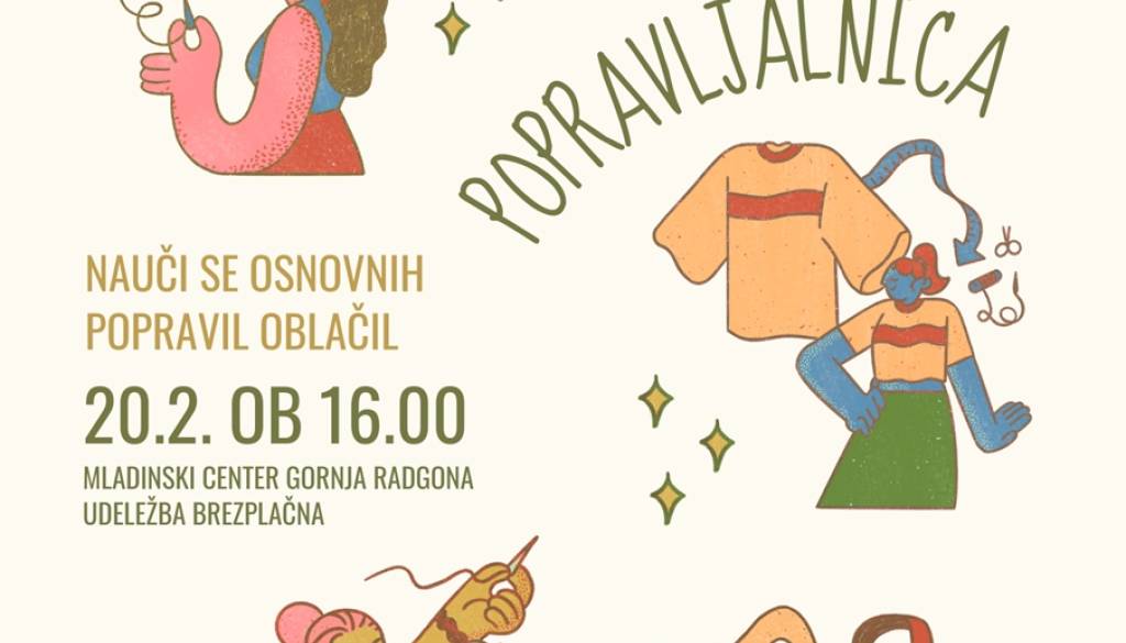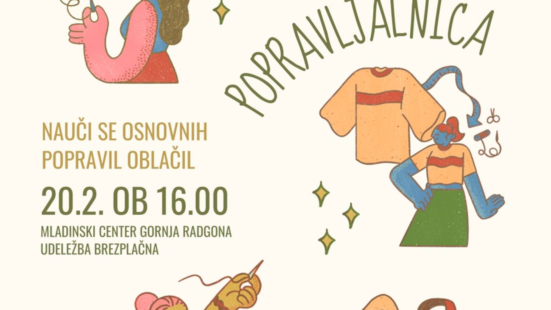 Prispevajte k načelu ponovne uporabe in trajnostne rabe oblačil ter odgovornosti do okolja, ter prinesite oblačila, ki so potrebna popravila, predelave ali zabave. Če imate šivalni stroj, in bi se radi z njim malo bolj spoznali, ga le prinesite. Na delavnici bo na voljo en šivalni stroj, obnovili pa bomo tudi osnove ročnega šivanja. Pod vodstvom usposobljene šivilje z mnogoletnimi izkušnjami se boste naučili osnovnih načinov popravil oblačil, t.j. zarobiti hlače ali krilo, prišiti gumb, zožati preprosto oblačilo, zamenjati zadrgo… Spretnejši in tisti, ki osnove že obvladate pa si lahko kakšno staro oblačilo tudi predelate ali naredite povsem nov kos.